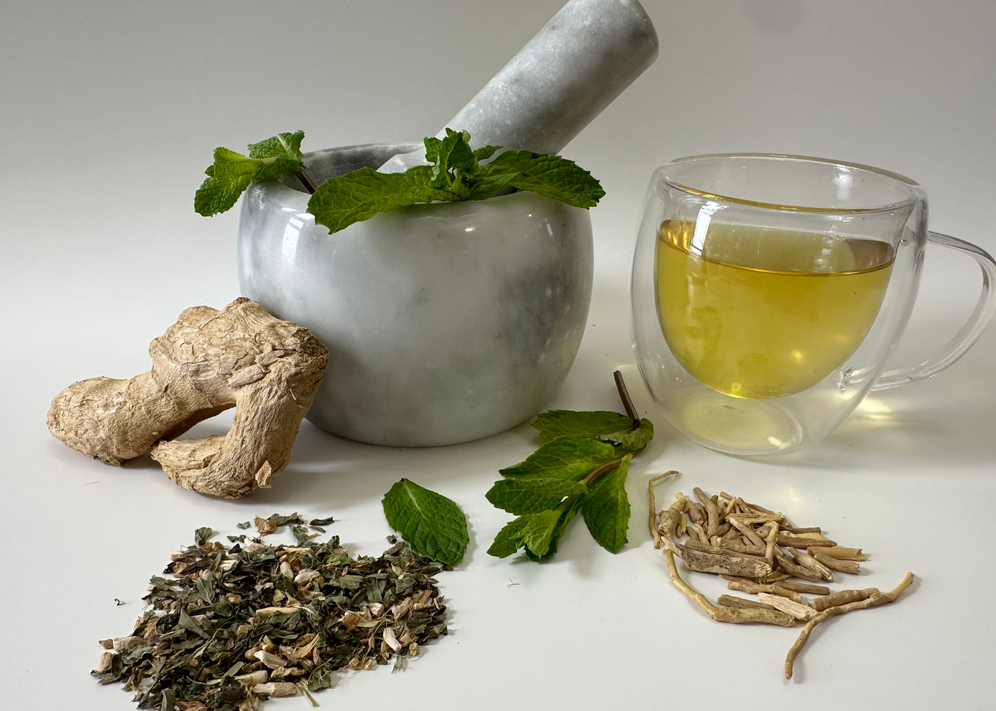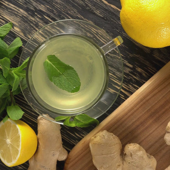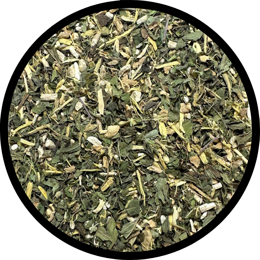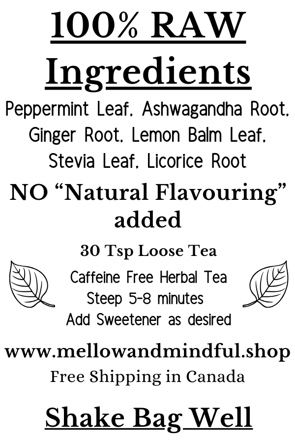 Indulge in the soothing serenity of our Mint, Ashwagandha, Ginger, Lemon Peel, and Licorice Root Tea. This blend is designed to enhance relaxation and balance, centering around the calming, anti-anxiety effects of ashwagandha. The cooling mint complements the ashwagandha by adding a breath of freshness, while ginger introduces a gentle warmth, energizing the senses without overwhelming. The addition of licorice root envelops it all with its inherent sweetness, offering a comforting finish. This tea is an ideal companion for moments when you seek tranquility and a mental reset, providing a naturally sweet, soothing escape that nurtures both body and mind.